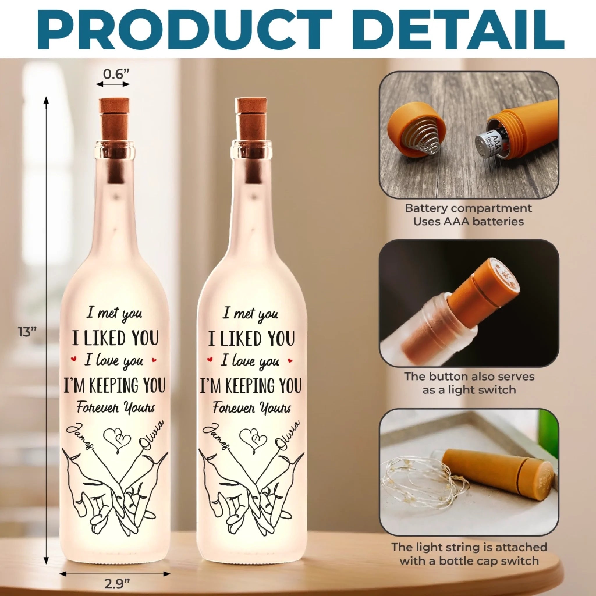 This bottle lamp is a unique and stylish decor item, blending sleek design with a soft, warm glow that brightens any space while adding a cozy, inviting touch. Perfect as a charming addition to your home, it radiates elegance and positivity. An ideal gift for anyone, suitable for all occasions: birthdays, holidays, anniversaries, graduations, Valentine's Day, Mother's Day, Father's Day, and just because! Whether for friends, family, or that special someone, this versatile gift is guaranteed to bring joy and make lasting memories.
