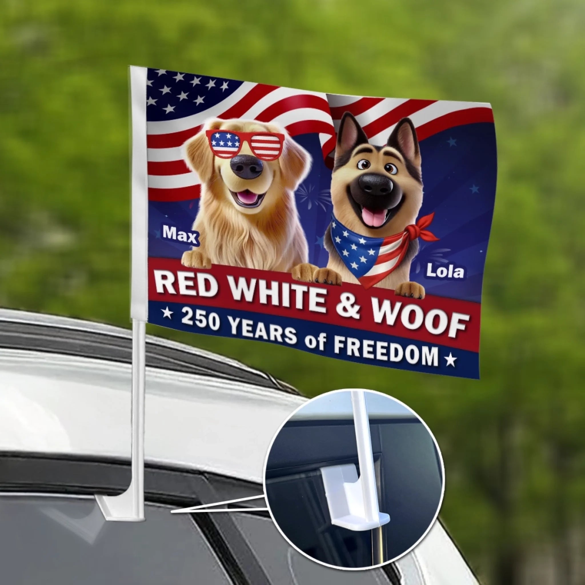 Custom Car Window Flag - Personalized America 250th Anniversary Gifts For Dog Lovers, Dog Dad And Mom - Rolling With Patriotic Pups