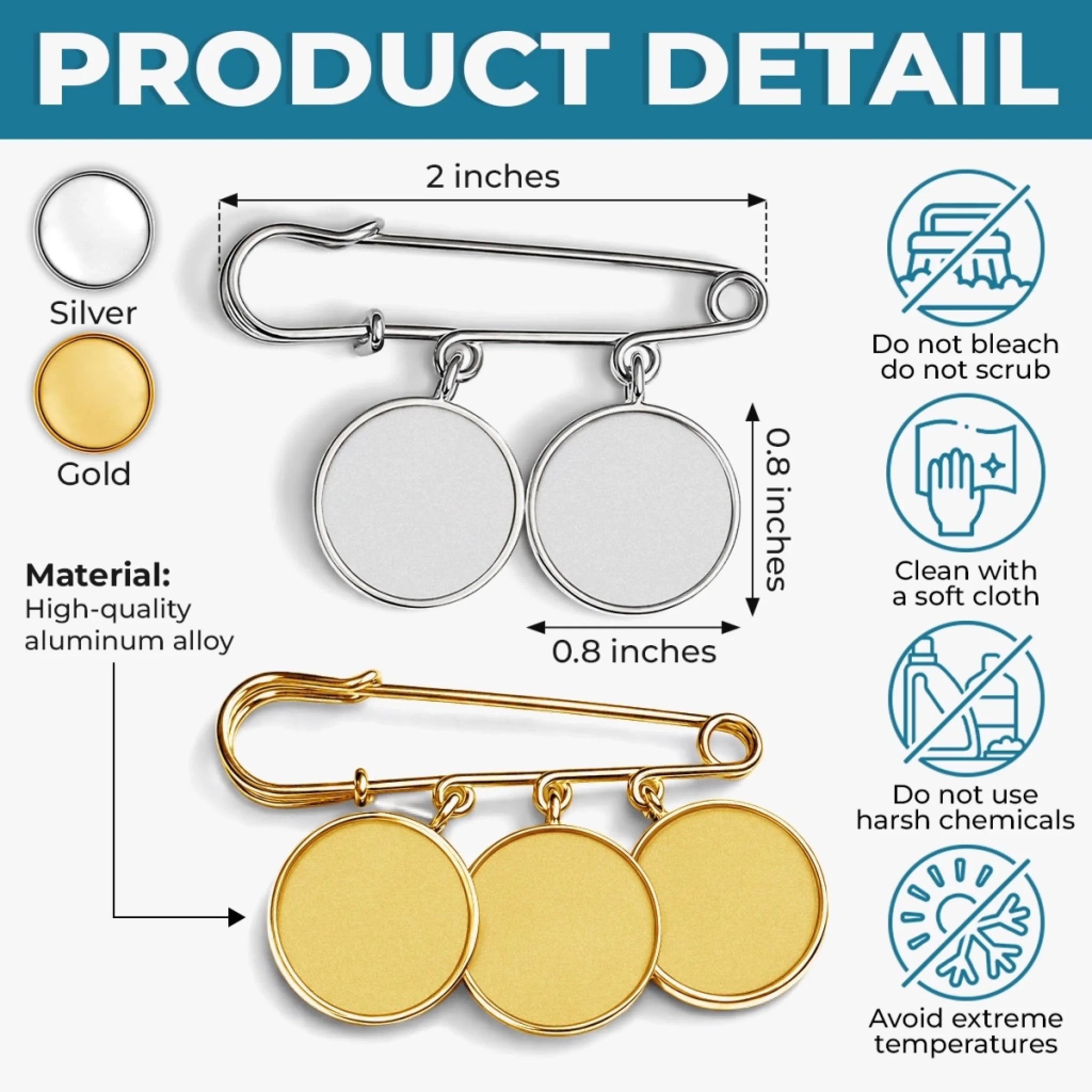 A secure safety pin backing allows quick and easy attachment to clothing, bags, or graduation gowns.