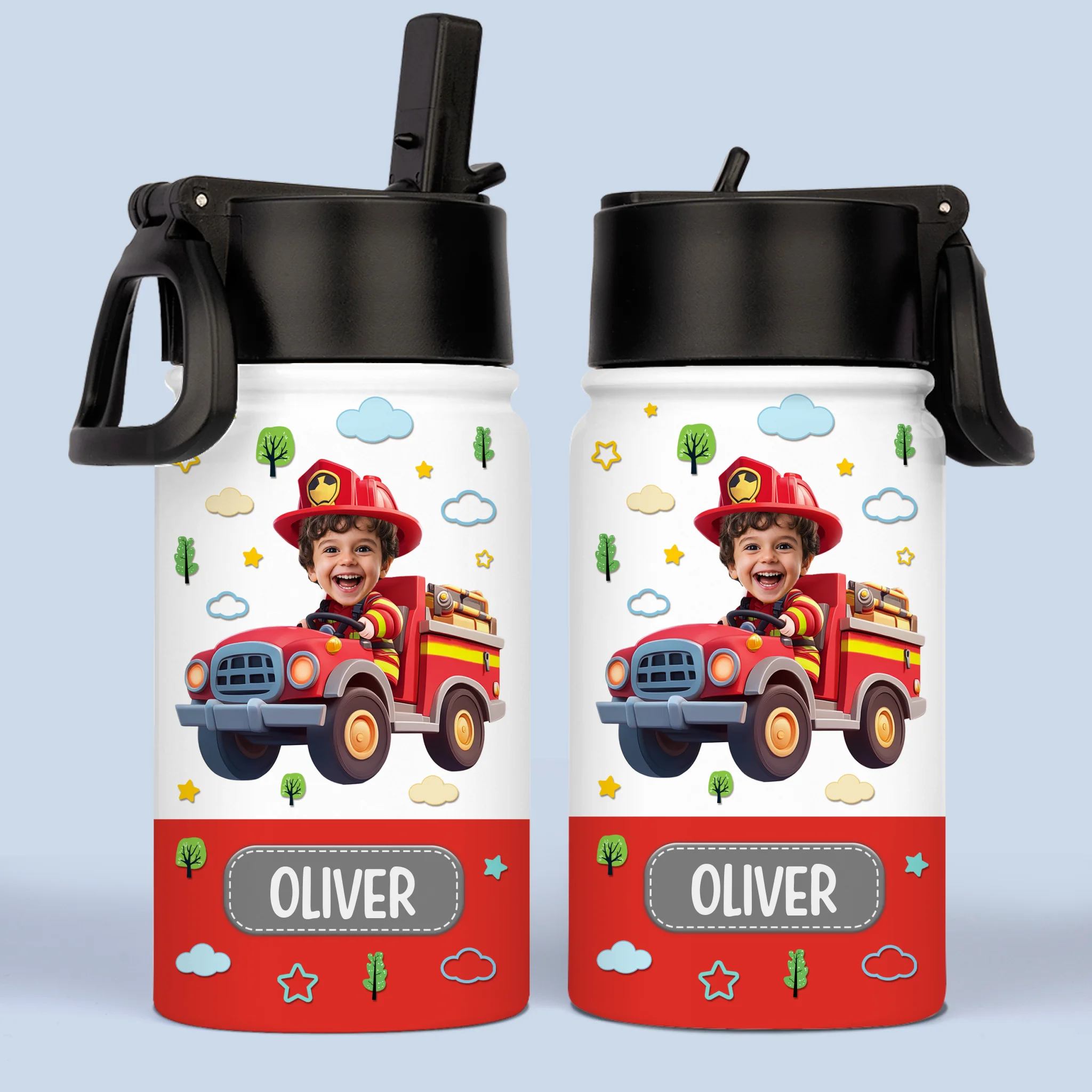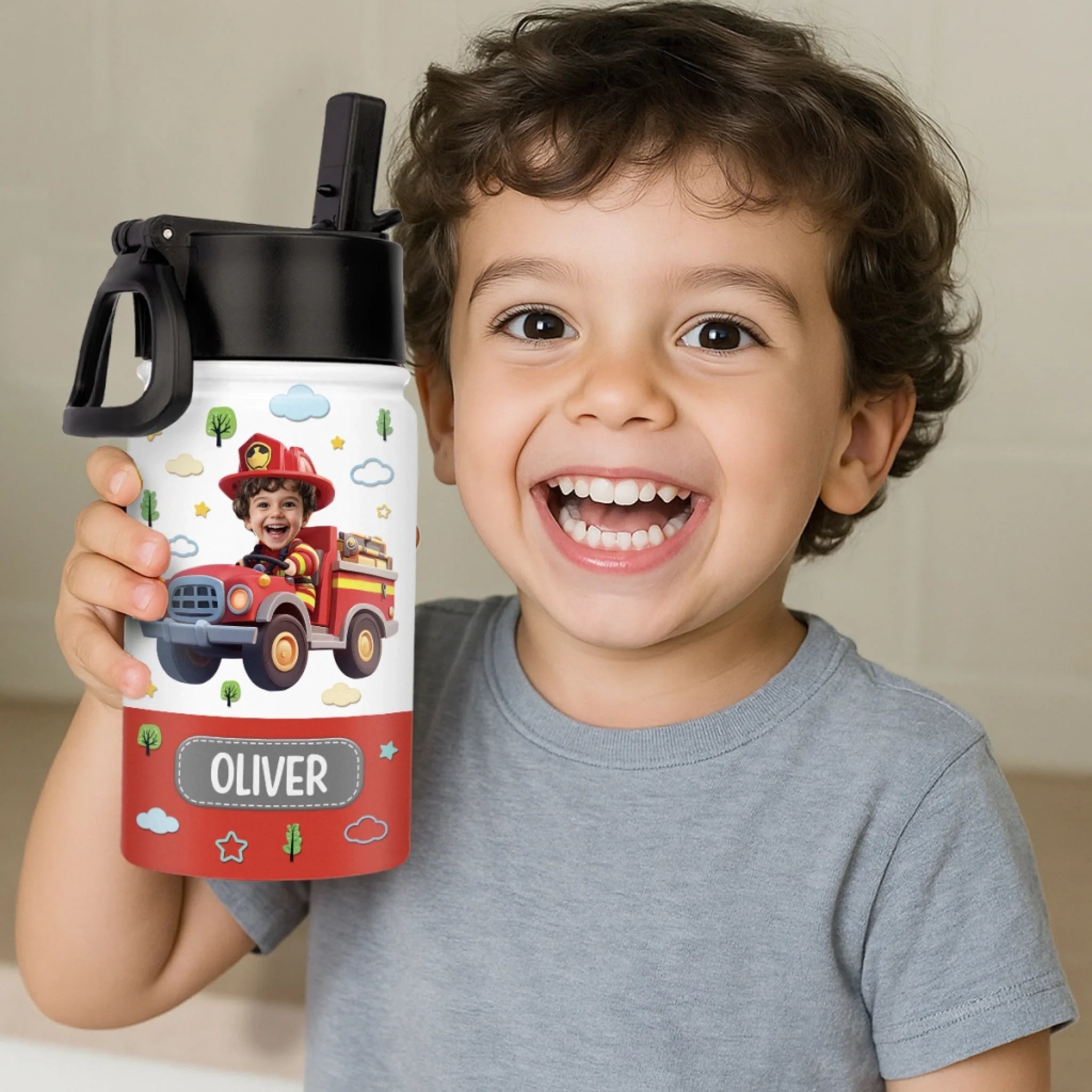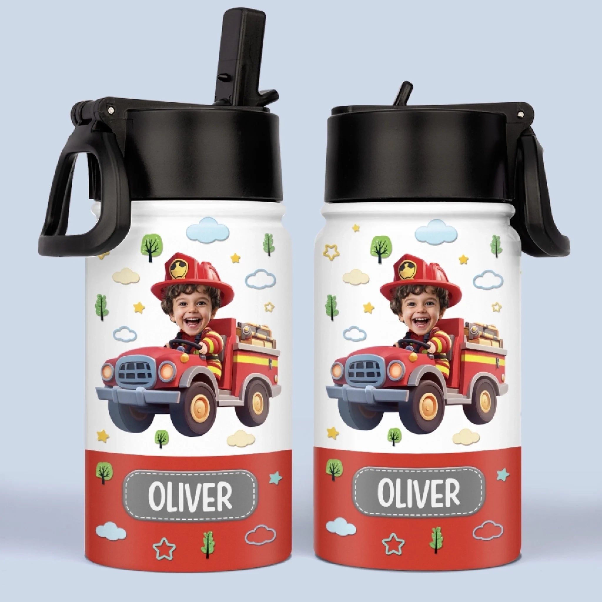 Custom Photo Kids Water Bottle - Personalized Back To School Gifts For Kids - Fire Truck Fun Ahead