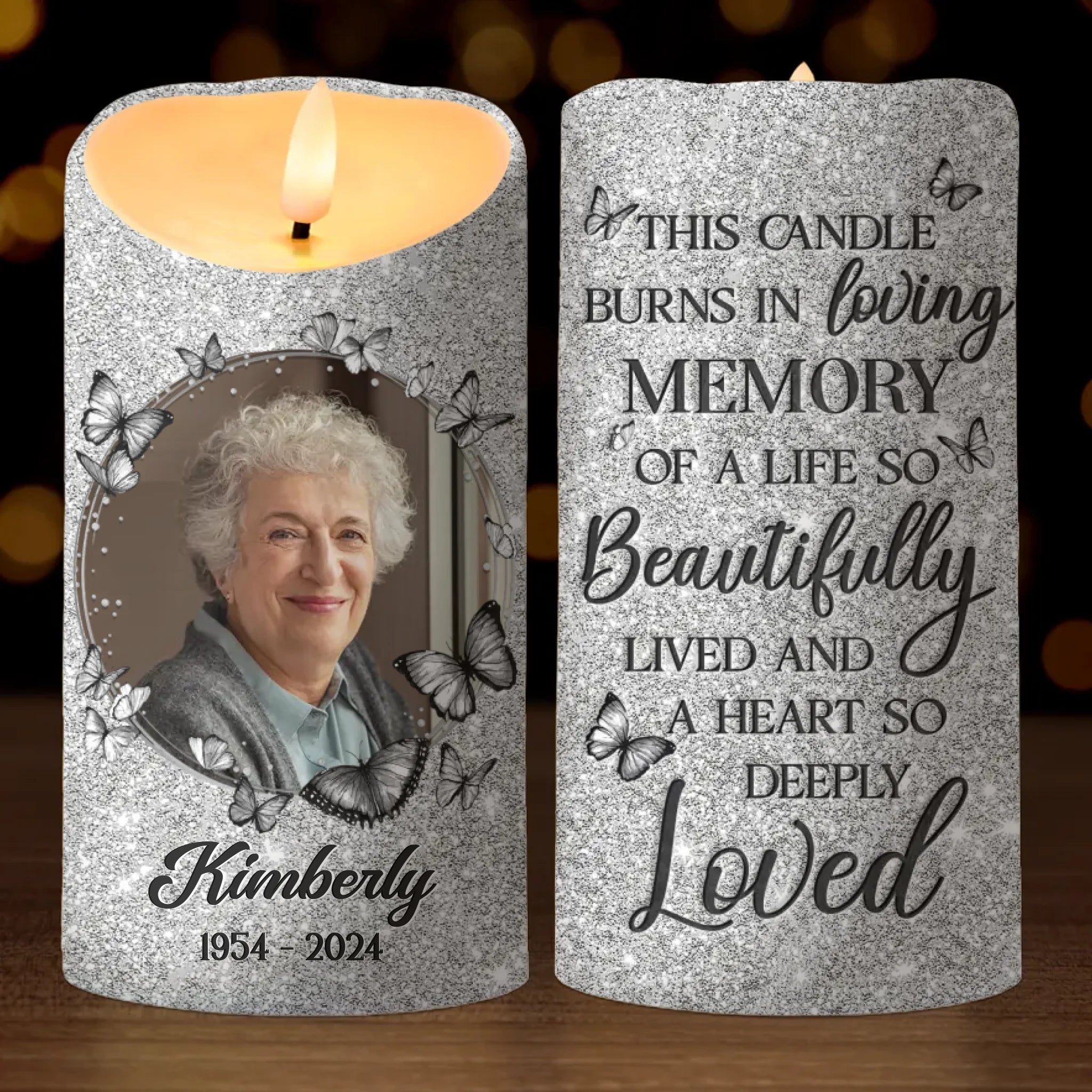 Custom Photo This Candle Burns In Memory Of A Life Well Lived And A Heart Loved - Memorial Personalized Custom LED Candle - Sympathy Gift, Christmas Gift For Family Members
