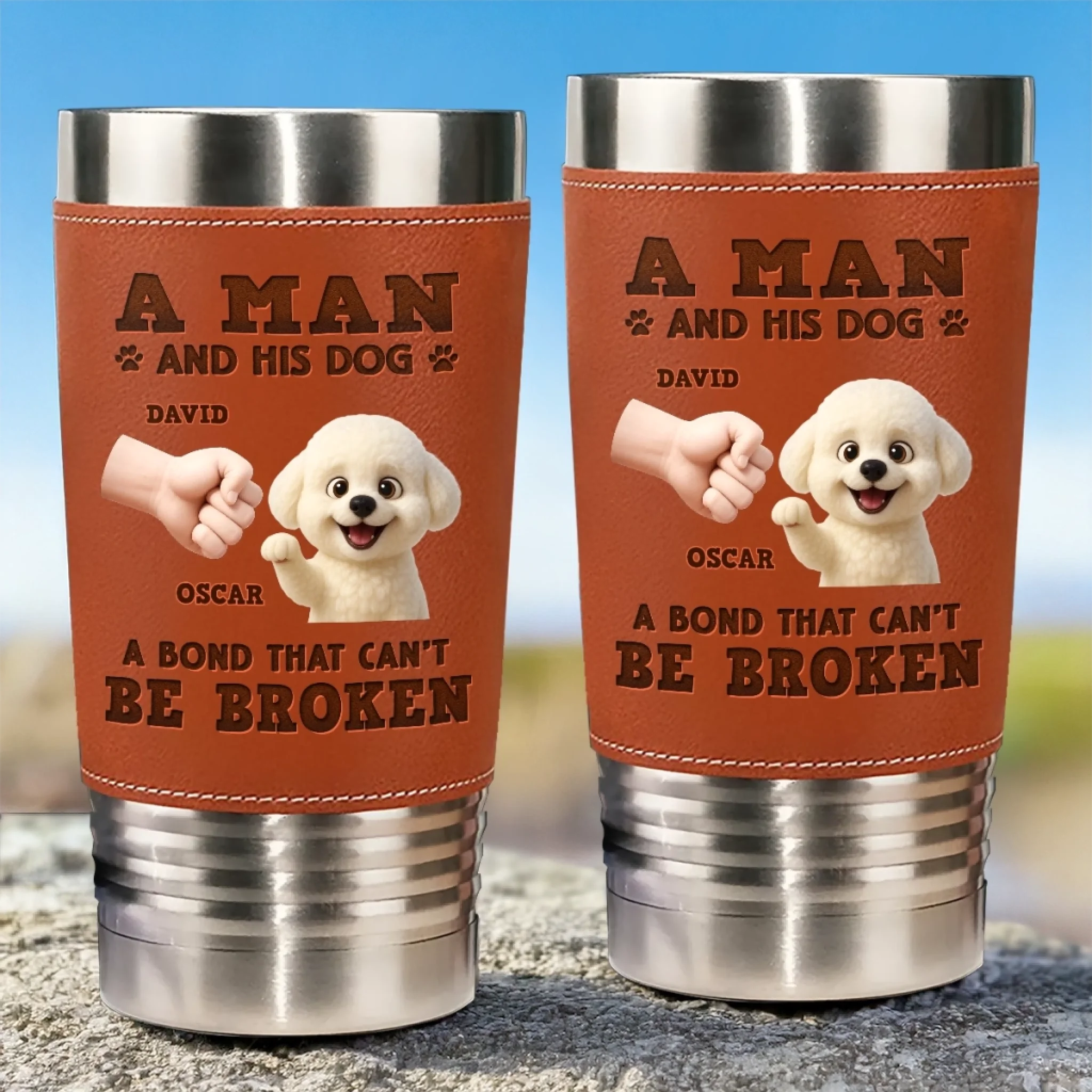 Custom Printed Leather Tumbler - Personalized Birthday Gifts For Dog Lovers, Dog Dad And Mom - Happiness Is A Wag