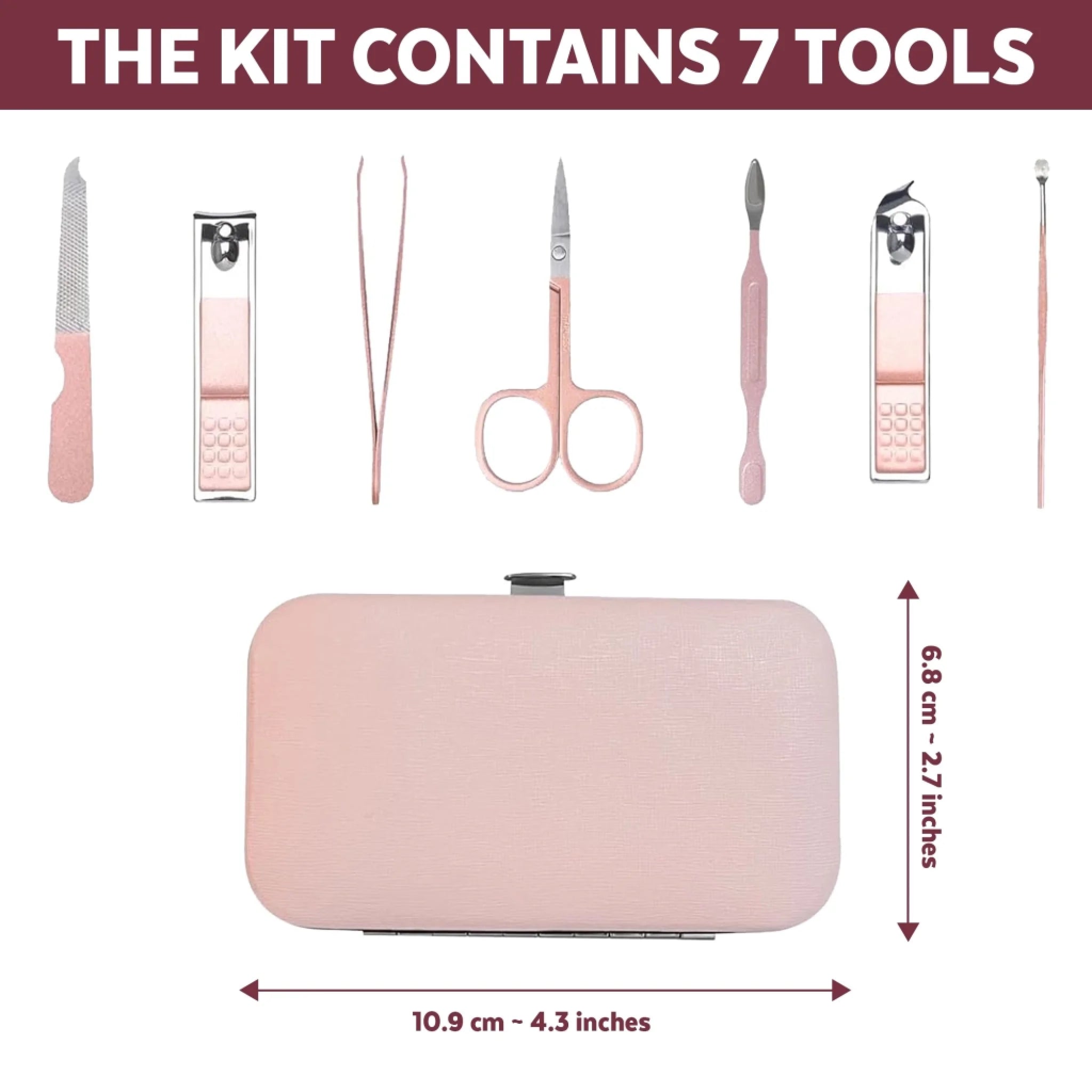 The kit contains 7 tools, nail clipper, bevel nail clipper, nail file, eyebrow scissors, eyebrow tweezers, nail cleaner and ear pick.